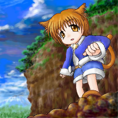 7.いさともあは平和に暮らしていました。(一年半)ある日もあは、森の奥をぬけ深い谷のある崖にやってきました。谷にはかつてつり橋がかかっていたといさから聞いていましたが、今は痕跡もありません。その時、いつか聞いた声がもあの頭の中で響きました。声は谷のむこうに行くように言っています。もあは恐る恐る谷をのぞきましたが、底が見えないほど深いのです。声はしだいに強くなり、もあの持っている石が光りはじめました。するともあの意思とはうらはらに、体がかってに崖に近づいていくのです・・・